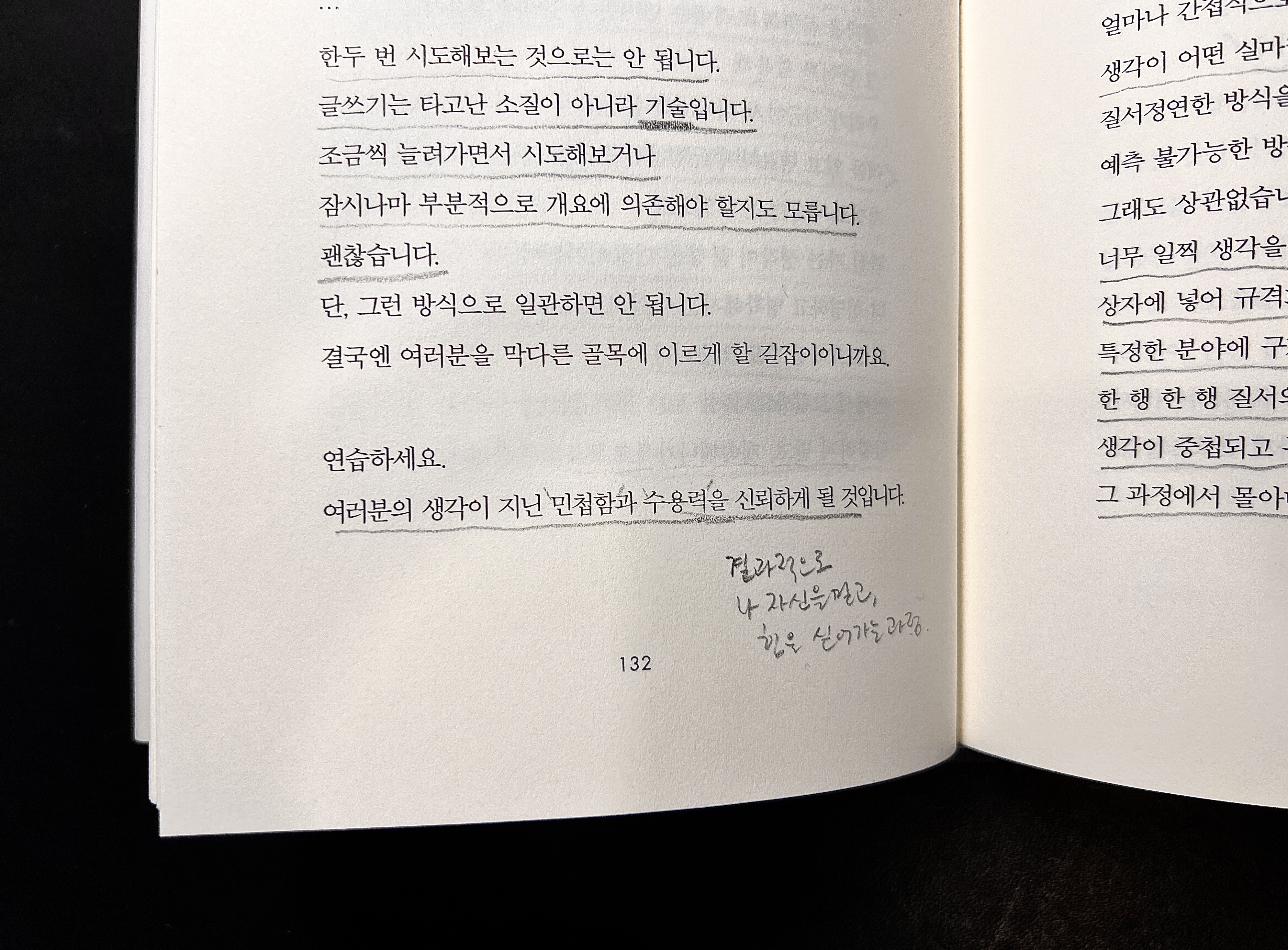 이와 함께, 저자의 문장들을 눈여겨봐야만 한다. 그의 문장과 말하는 방식은 다른 글들과 다르다. 그가 전하려고 하는 것이 명징하게 전해진다. 아주 선명한 도형들을 보여주는 것 같다. 전혀 추상적이지 않다. 이 책을 읽는 과정 자체로 글을 어떻게 써야 하는지 그 방법이 실용적인 테크닉으로 전해지는 것이 아니라 아주 큰 덩어리로 확실하고 묵직하게 와닿는다. 짧은 문장들이 얼마나 매력적일 수 있는지 직사광선 뒤에 맺힌 그림자처럼 진하게 보여준다.